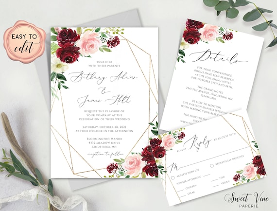 Burgundy Wedding Invitation Set Printable Editable Marsala Blush