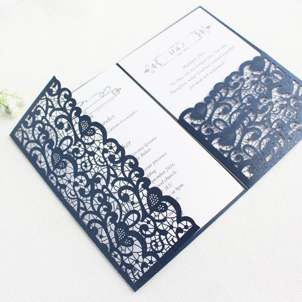 Modern Navy Blue Laser Cut Pocket Wedding Invitation Suite Tri