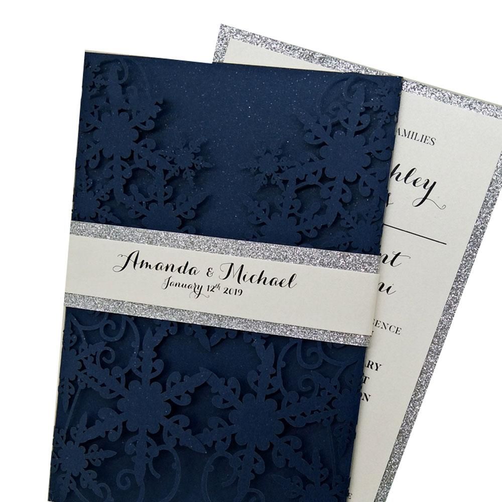 2019 Navy Blue Shimmy Snowflake Laser Cut Wedding Invitation With