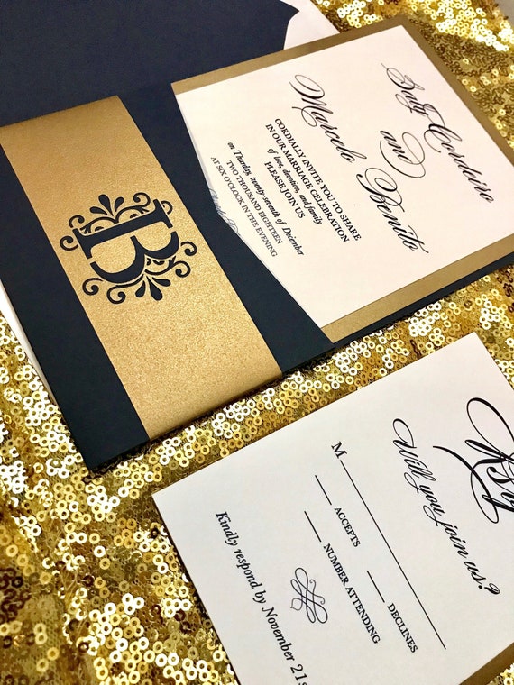 Navy Blue Gold Wedding Invitation Pocket Wedding Invitation Etsy