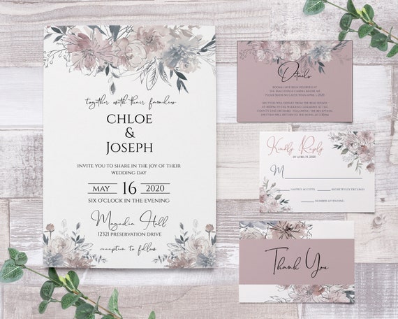 Dusty Rose Wedding Invitations Mauve Wedding Invitations Grey