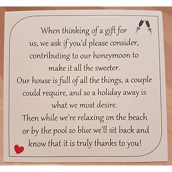 Wedding invitation wording examples asking for money wedding tips qa. Below are some examples of popular poems which make asking for money or honeymoon contributions a little bit easier honeymoon. The wedding gift is a time honored tradition and can really help with getting started in your new life.