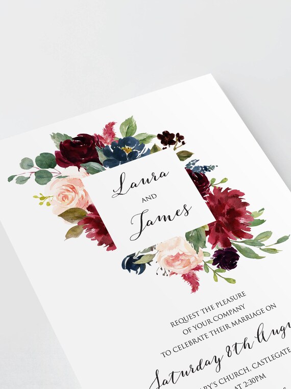 Burgundy Floral Wedding Invitations Burgundy Navy Invite Etsy