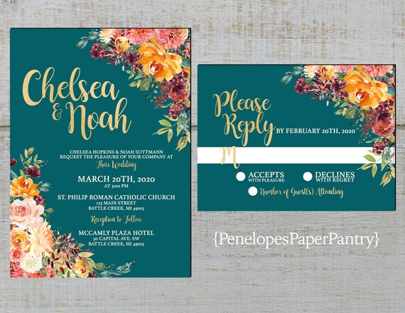 Elegant Teal Floral Fall Wedding Invitationburnt Etsy